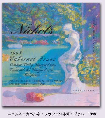 ニコルス カベルネ・フラン シエネガ・ヴァレー・ヴィンヤード&ヴィーニャ・デル・ソル・ヴィンヤード1998 シエネガ・ヴァレー・ヴィンヤードのブドウを76%、ヴィーニャ・デル・ソル・ヴィンヤードのブドウを24%使用しています。カベルネフランが75%、その他にメルローが7%、カベルネ・ソーヴィニオンが18%ブレンドされています。アリエ、トロンセ産のフレンチオークで23ヶ月熟成し、ボトル詰して9ヶ月間ボトル内での熟成を行いました。 透明感ある赤茶かかった濃いルビー色、香りは割と強めで華やかな印象です。ブラックチェリー、レットベリーにココア、コーラ、スモーク、スパイス、土の香りとほのかなミントなどを感じ、カベルネフラン特有の青野菜などの香りはそれ程強くなく、グリンアスパラの様なクリーミーで甘味のある野菜を連想させます。口当たりは、なめらかでエキスの詰まったジェルが滑り込む様な食感です。豊潤な果実味中心というより、さっぱりとしたコクのある甘味とキュートな酸味とがバランスよく、ビターチョコの様でもあります。アフターは長くキメの細かなタンニンとフレンチオークから受ける上品なトースト香がいつまでも口の中に広がります。カリフォルニアらしいカベルネフランの良さがあふれた、素直に美味しいと言えるワインです。フレンチオーク樽で23ヶ月熟成。