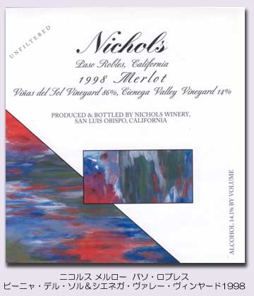 ニコルス メルロー パソ・ロブレス ビーニャス・デル・ソル&シエネガ・ヴァレー・ヴィンヤード1998 ニコルス メルロー 1998は、メルローが75%、カベルネ・ソーヴィニヨンが10%、カベルネ・フランが15%です。ヴィーニャ・デル・ソル・ヴィンヤードは、パソロブレス地区の隣に位置する温暖なワイン産地のサンミゲル地区にあります。暖かい日中と涼しい夜という寒暖の差のある気候がメルローの生育にたいへん合っています。昼間の暖かい気候によりメルロー本来の鮮やかな色をしたワイルドベリーやプラム、チェリーのフレーバーが助長され、反対にクールな夜の気温がブドウの木を休ませフレーバーを閉じ込める働きをするのです。またこの気温差のある気候により、果実のハングタイムが長くなり、果実の熟成がゆっくり進むのでたいへん凝縮感のある果実となります。 このメルローはスパイス、オーク、土っぽい香り、果実のフレーバーが絶妙に絡み合っています。口に含むとブラックベリー、すぐり、プラム、ワイルドベリーの香り、味わいが口いっぱいに広がります。そしてそこにキャラメル、スモーク、トースト香が品よく重なります。複雑味があり、芳醇、エレガントなメルローです。このワインは大変ユニークな醸造工程を経ています。収穫したブドウの3分の1は房のまま、小さな上の空いた醗酵樽に入れてフレーバーと色の成分の抽出を最大限に引き出します。 7日から10日の間、一日に何度かのパンチングダウンを行います。それからプレスし、フレンチオークの樽に詰めました。アリエ、トロンセ産のフレンチオークで24ヶ月熟成し、ボトル詰して12ヶ月間、ボトル内での熟成を行いました。フレンチオーク樽で23ヶ月熟成。