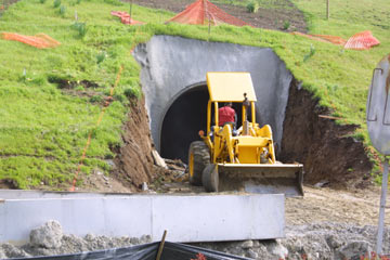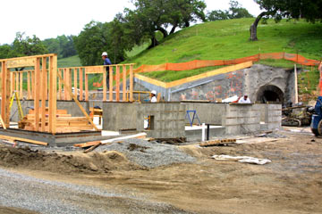 建物となりの小高い丘にくり貫かれて作られているカーヴ。2箇所の入り口と、丘の上に登ることの出来るエレベーターが取り付けられます。丘の上にはテイスティングのためのテラスが作られる予定でそこからのヴィンヤードの眺めは最高のものとなるでしょう。 |