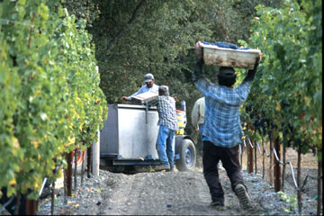 手作業で摘み取られたぶどうの房は丁寧に、手渡しで運ばれる。