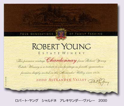 ロバート・ヤング シャルドネ アレキサンダー・ヴァレー 2000 上質なロバート・ヤング・エステートで育ったシャルドネ特有のフルボディ、クリーミーでリッチな味わい。グラスを近づけた途端、芳醇で魅惑的なアロマが広がります。グアバ、パイナップル、洋ナシ、メロンやスパイスの香り、フレーバーがあり、トロピカルフルーツと燻したオークの調和が上品なワインです。長く心地よい余韻があり、ワインだけでも十分楽しめますし、お料理との相性を楽しむこともできるワインです。飲み頃は今すぐから2006年ごろまで続きます。1999年に続き、この2000年ヴィンテージもワイン各誌においてたいへん高い評価を受けております。