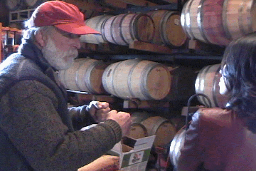 昨年のビンテージが眠る樽の前で説明をするチャールズ。 |